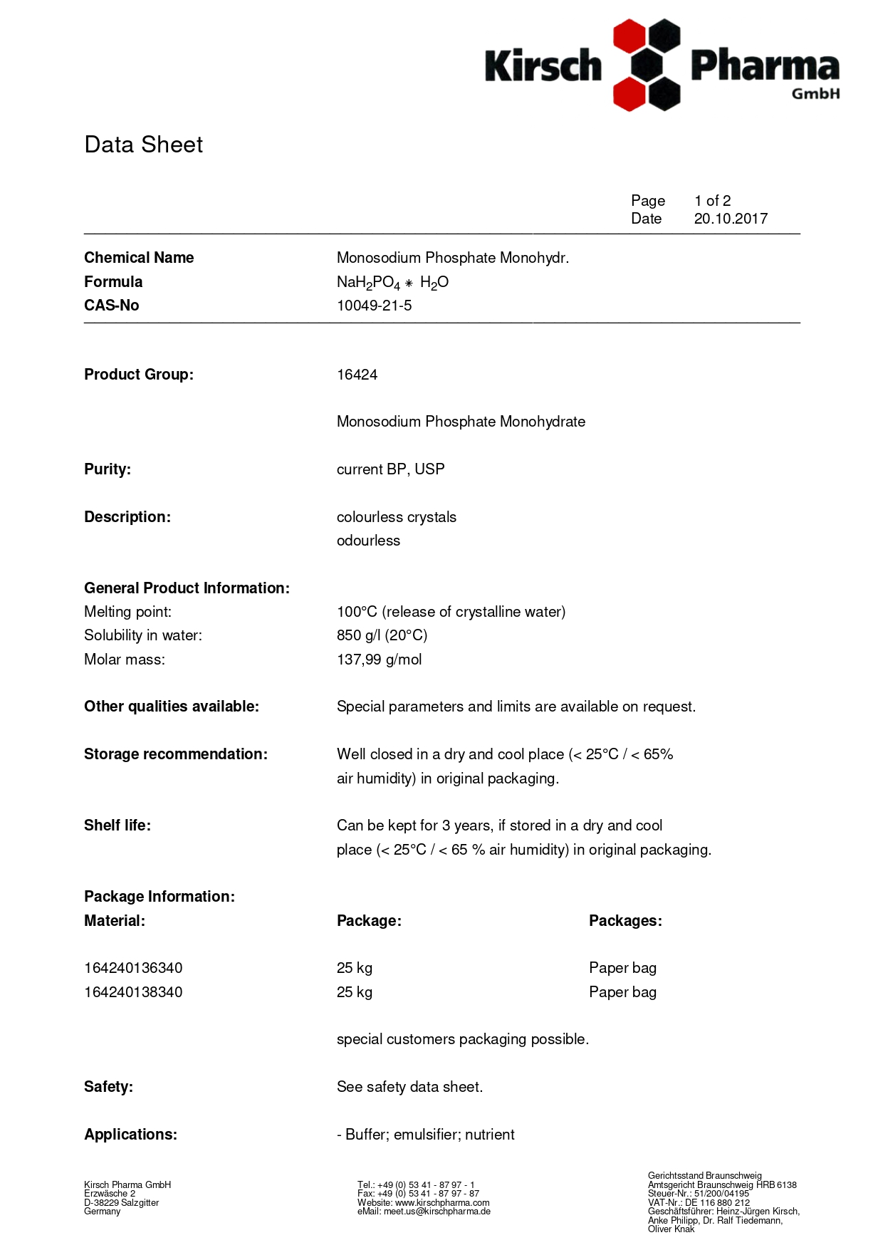 Натрий дигидрофосфат моногидрат — бесцветные кристаллы без запаха. Применение: