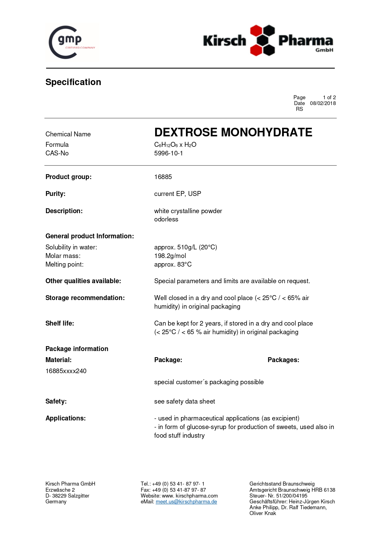 Декстроза моногидрат — белый кристаллический порошок со сладким вкусом, без запаха. Применение: